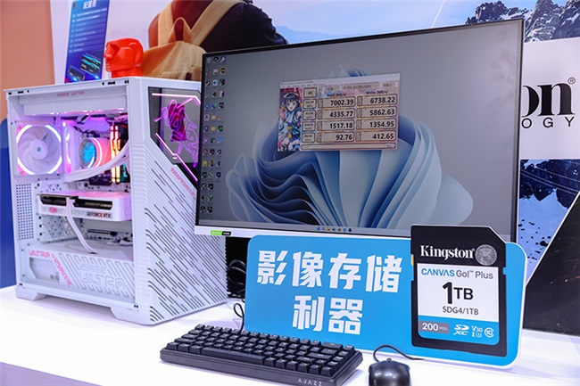 而如果对传输速度有更高的要求,并且是台式机用户,金士顿KC3000 PCIe 4.0 NVMe M.2固态硬盘就是不错的选择,在现场的主机中就安装了KC3000以供观众们体验。它采用3D TLC NAND闪存颗粒,可以实现高达7000MB/s的传输速度,还拥有4GB的独立缓存。电脑上显示的跑分结果就是KC3000的成绩,足见其性能非常优秀。